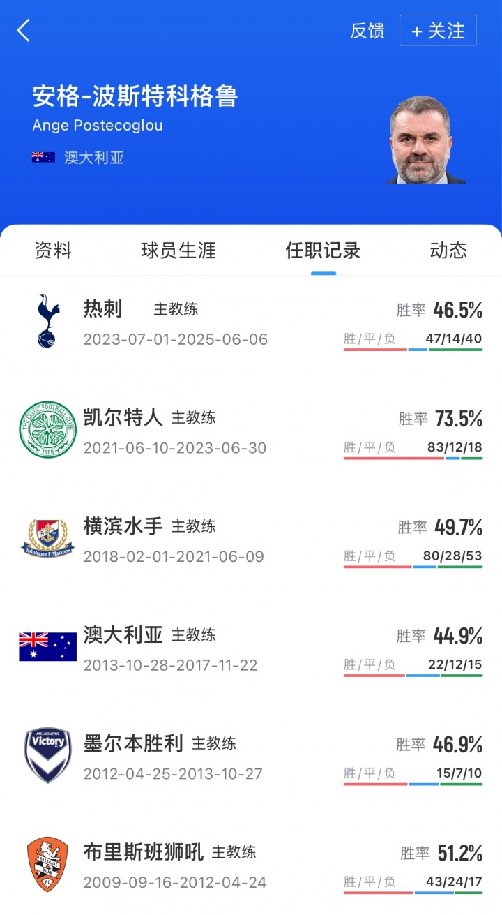 60岁的澳大利亚主帅波斯特科格鲁,曾任澳大利亚国家队、横滨水手、凯尔特人等多支球队教练;2023年7月至2025年6月,波斯特科格鲁执教英超球队热刺,上赛季在带领热刺获得欧联杯冠军,但联赛仅排名第17后下课。